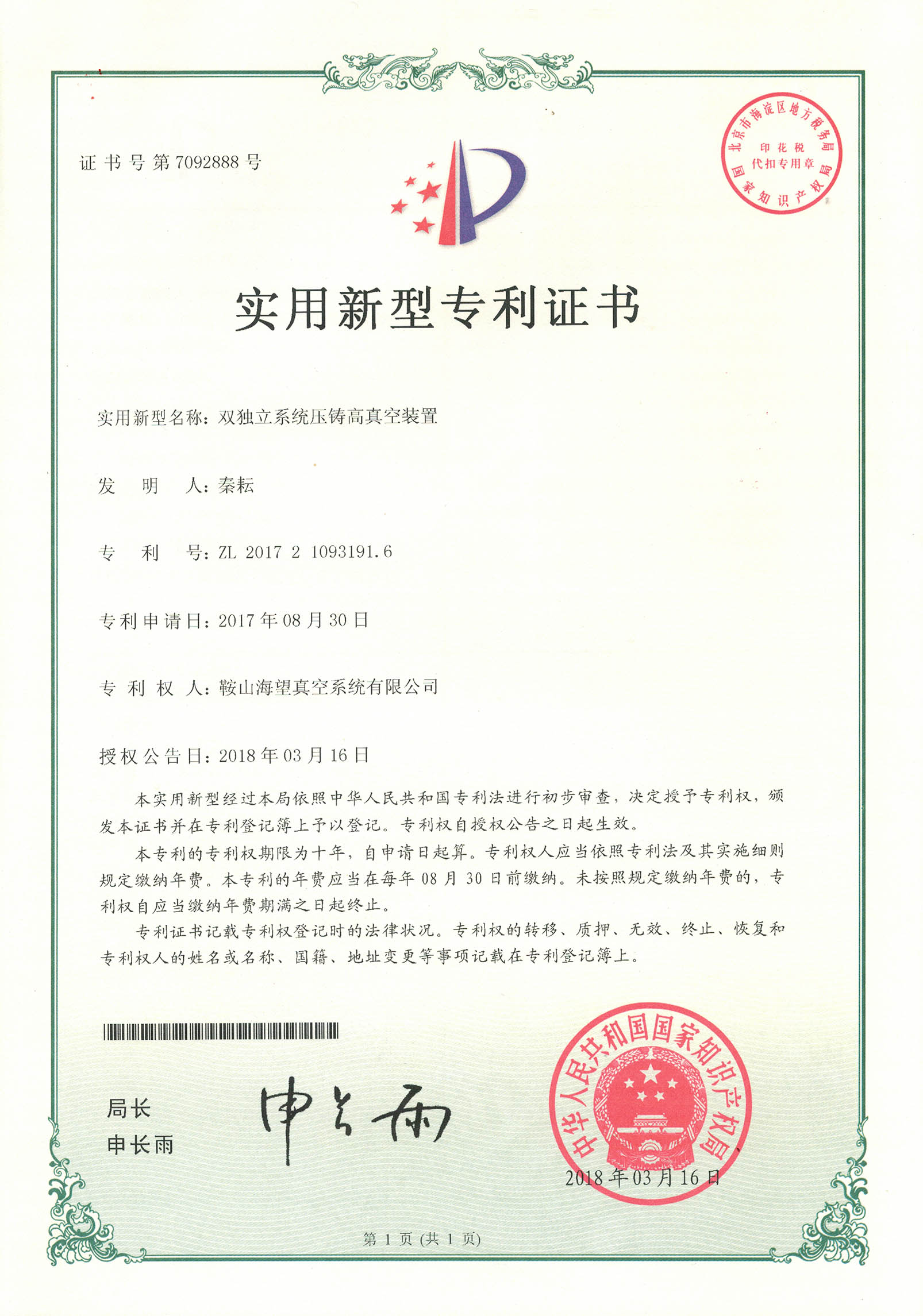 ????????鞍山海望科技有限公司成立于2010年,前身為鞍山海望真空設(shè)備制造有限公司,坐落在美麗的遼東半島鞍山。作為生產(chǎn)壓鑄真空系統(tǒng)的專(zhuān)業(yè)生產(chǎn)廠(chǎng)家,海望對(duì)研發(fā)持續(xù)投入,先后榮獲多項(xiàng)國(guó)家專(zhuān)利,自主研發(fā)出雙系統(tǒng)高真空機(jī)和強(qiáng)力式真空閥等產(chǎn)品,大大提高了真空排氣效率,并于2018年獲得了CE認(rèn)證。